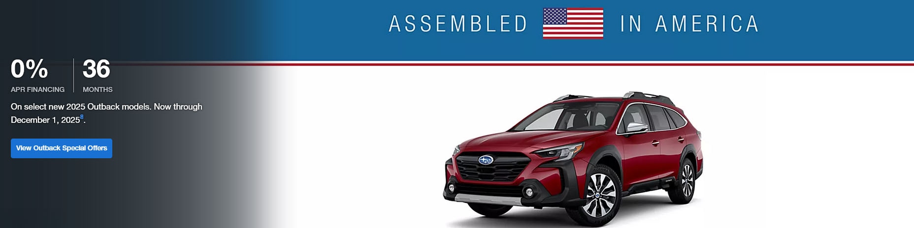 All Finance Offers require credit approval. 0.9% APR for 72 months available for 2025 Previous Loaner Outback models… 1.9% APR for 63 months available for 2025 Previous Loaner Crosstrek models. See below for full Disclosure. Offer Expires 12/1/2025.